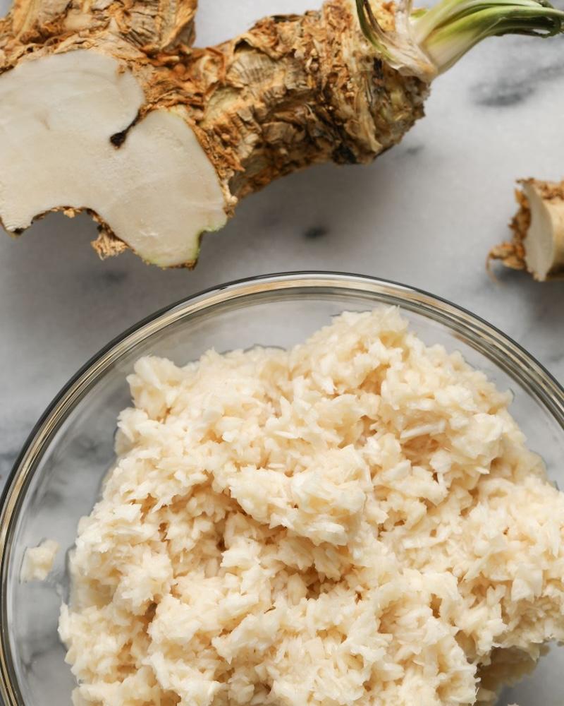 - Get ready to cry. Peel the skin off the bottom half of your horseradish root and grate finely until you have 2¾ oz. You will wish you had goggles.