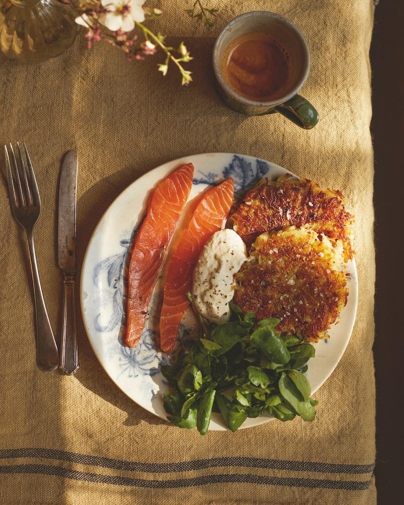 - Dress the watercress with a little lemon juice, olive oil and sea salt and serve with the crispy latkes, horseradish and thickly cut smoked trout.