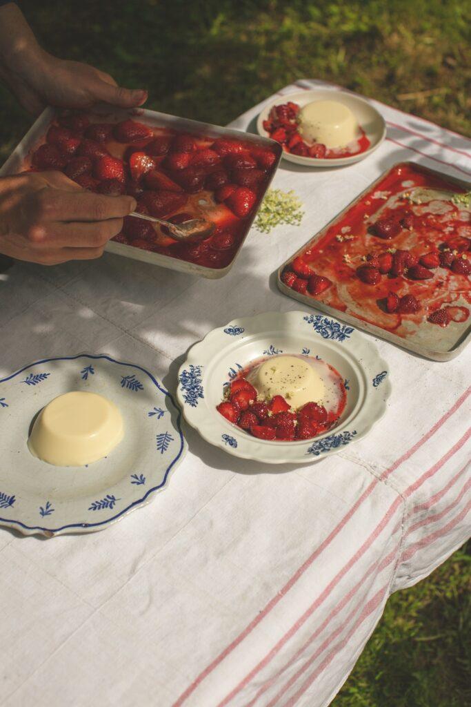 - To serve, dip each panna cotta mold into boiling water for just a few seconds, then place a plate on top and flip. If it doesn’t release because of the vacuum, it sometimes needs a bit of a shake–just hold the plate and mold tightly while you do so. Spoon over the warm strawberries with lots of their liquor and top with a few decorative elderflowers.