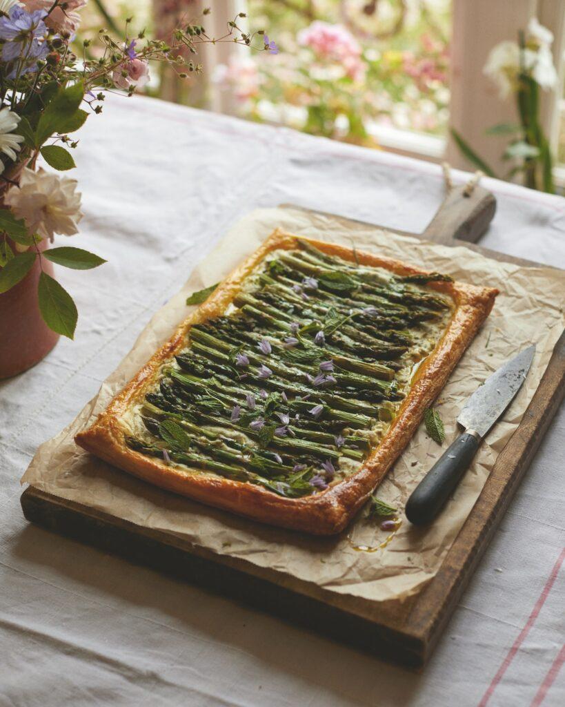 - Snap the asparagus at the bottom to remove the woody ends–I save these over the course of a week, making the most of asparagus while it’s in season, and use them to make soup. Spread the ricotta over the pastry, taking care to stay within the scored border. Then top with the spears of asparagus, drizzle with olive oil and season well. Whisk the egg and brush the edges of the pastry so they go golden in the oven. Bake for 20 to 30 minutes, until crisp and puffed up. When out of the oven, sprinkle with the last of the herbs and squeeze over some lemon juice. Serve immediately while piping hot.