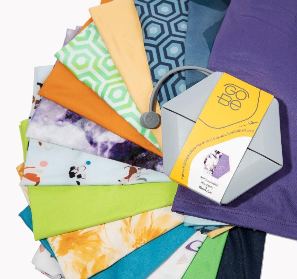 In July 2021, we launched Go-Be Sleeves – airplane tray covers that contain a non-toxic, hypoallergenic antimicrobial technology that resists microorganisms from sticking to the fabric. Our sleeves are reusable and washable and knitted from a fibre created from BPA-free plastic waste pulled from landfills and oceans, so they’re eco-friendly and sustainable —and also made in the USA!