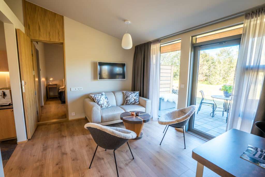 The rooms and suites at Hotel Húsafell are spacious and elegantly decorated, with natural materials and warm colours for a cozy and inviting atmosphere, each with large windows offering stunning views of the mountains and lava fields.