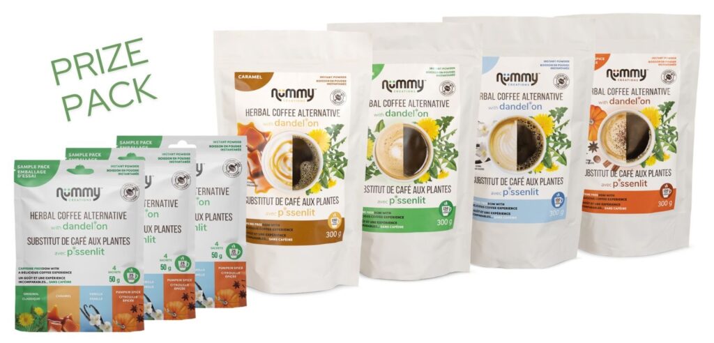 This prize pack consists of one each of Nummy Creations’ Coffee Alternatives—Original, Caramel, Vanilla & Pumpkin Spice—plus three sample packs, a retail value of $150 CAD. Enter by completing the form below. Good luck!