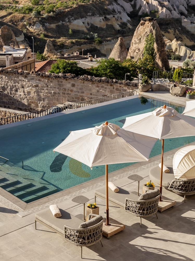 The hotel has multiple restaurants, one of the largest natural underground wine cellars in Europe, as well as a state-of-the-art fitness facility and outdoor swimming pool that offers views of Mount Erciyes and Güvercinlik Valley.