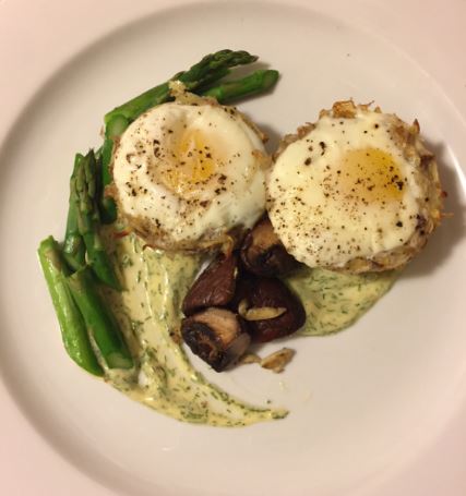 Using muffin tins, create a bowl/funnel shape that covers the bottom and sides of the tin evenly with the shredded potato mixture. Crack one, whole egg inside the centre of the funnel shape.